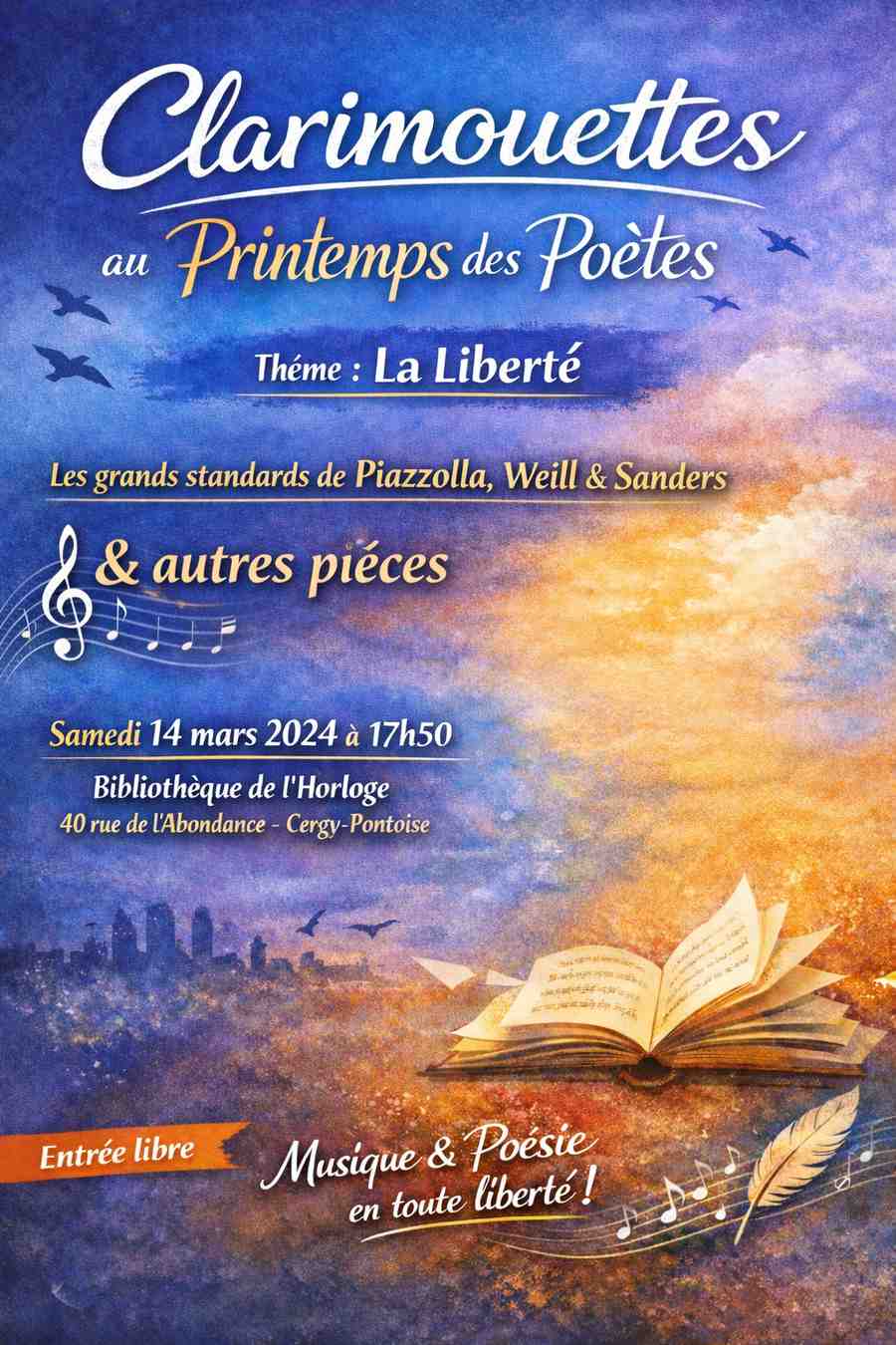 L’ensemble Clarimouettes, formation issue de l’Harmonie de Pontoise, se produira le samedi 14 mars à 18h dans le cadre du Printemps des Poètes à Cergy-Pontoise.